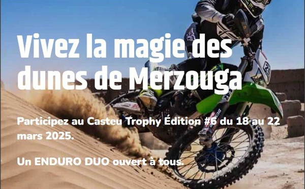 L’enduro CASTEU TROPHY à Merzouga. Il s’agit d’un Enduro Duo où les pilotes roulent à deux, avec des liaisons GPS, des spéciales banderolées de type...